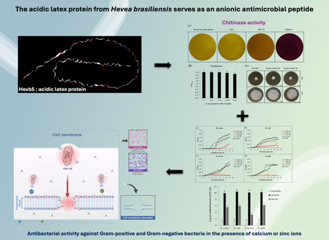 The allergenic protein Hevb5 displayed notable chitinase activity and exerted strong antibacterial effects against both Gram-positive and Gram-negative bacteria. Its antibacterial potency increased in the presence of zinc or calcium ions, suggesting that Hevb5 interacts with microbial membranes through metal ion–mediated cationic salt bridges, ultimately causing cell lysis and bacterial death.
